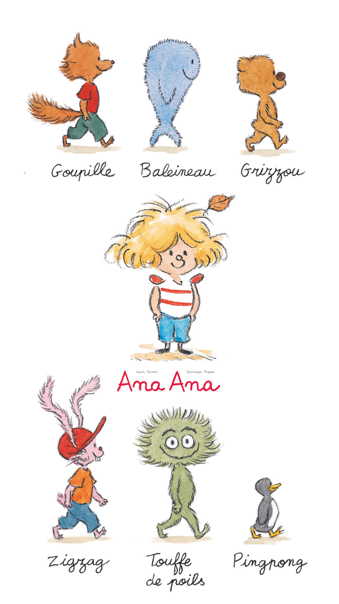Des doudous qui parlent, ça n’existe pas... sauf ceux d’Ana Ana, bien sûr ! Ils s’appellent Zigzag, Touffe de poils, Pingpong, Goupille, Baleineau et Grizzou. Ils sont menés à la baguette par Ana Ana mais font tout pour l’amuser et l’aider à s’évader dans un monde imaginaire drôle, coloré et joyeux !